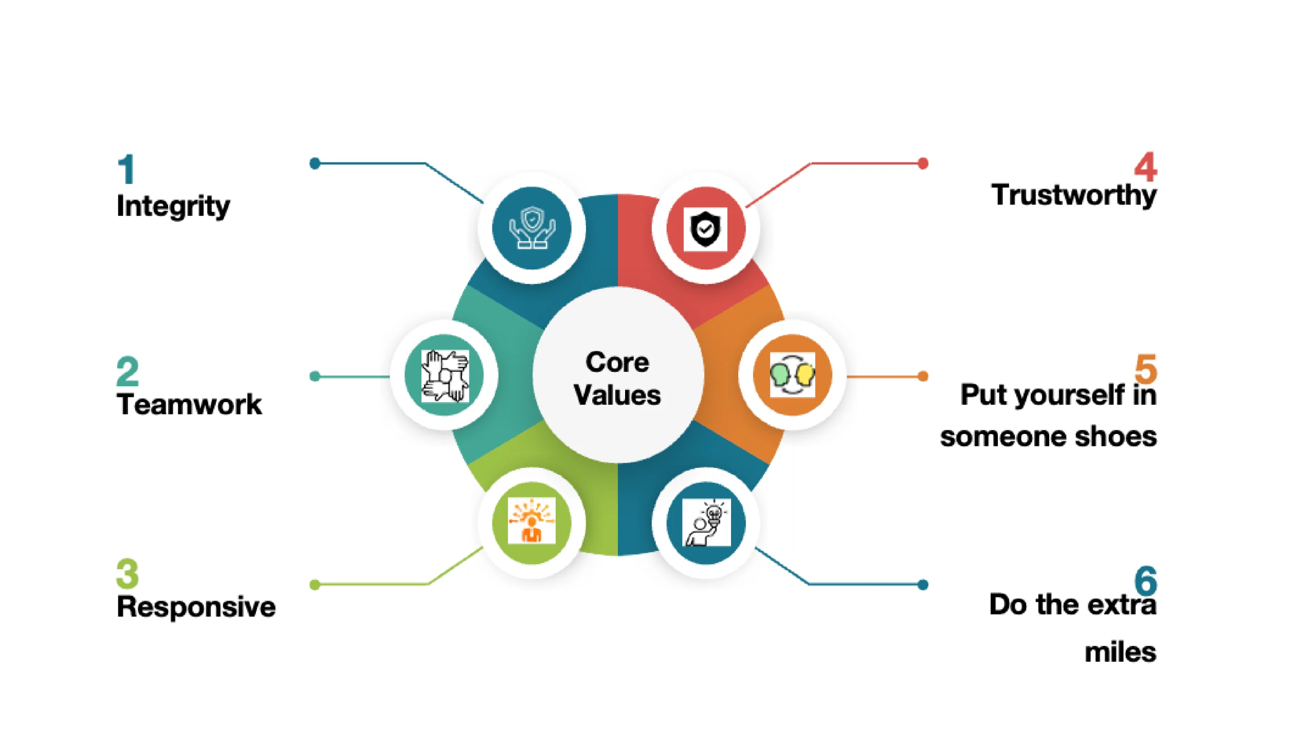 We have six core values that guide our decisions, shape our professional conduct, and serve as the foundation of our organizational culture, influencing how we collaborate, engage with stakeholders, uphold ethical standards, and consistently deliver value with professionalism and accountability.